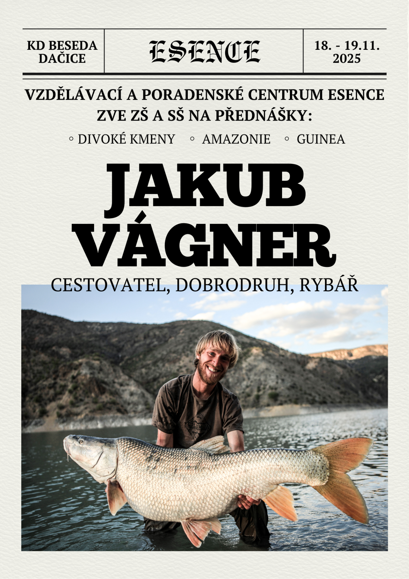 Pozvání Vzdělávacího a poradenského centra ESENCE Dačice přijal další milý host, kterým byl cestovatel, dobrodruh a rybář Jakub Vágner.